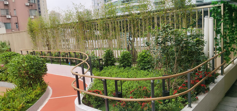 同時,頂樓設(shè)有屋頂康復(fù)花園,采用了我們公司提供的能隨處折彎的室外抗菌扶手。如圖二/圖三:
